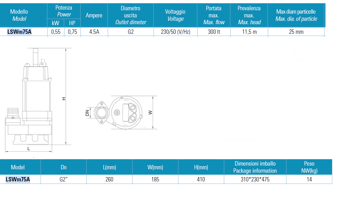 Elettropompe sommergibili acque sporche e cariche HP 0,6 LSWM75A LEO