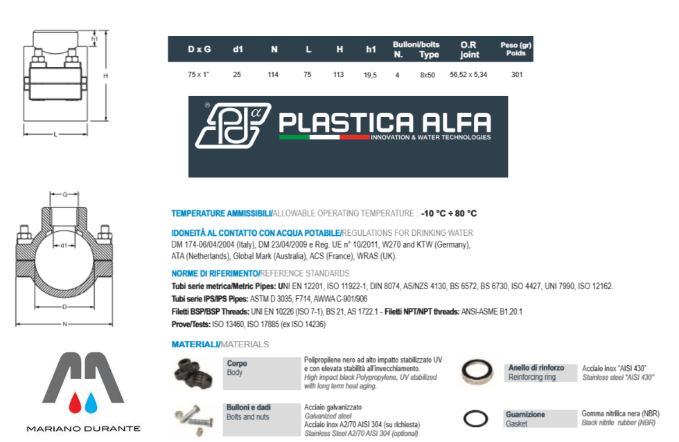 PRESA A STAFFA PER TUBO ACQUA POLIETILENE PLASTICA ALFA 75X1″